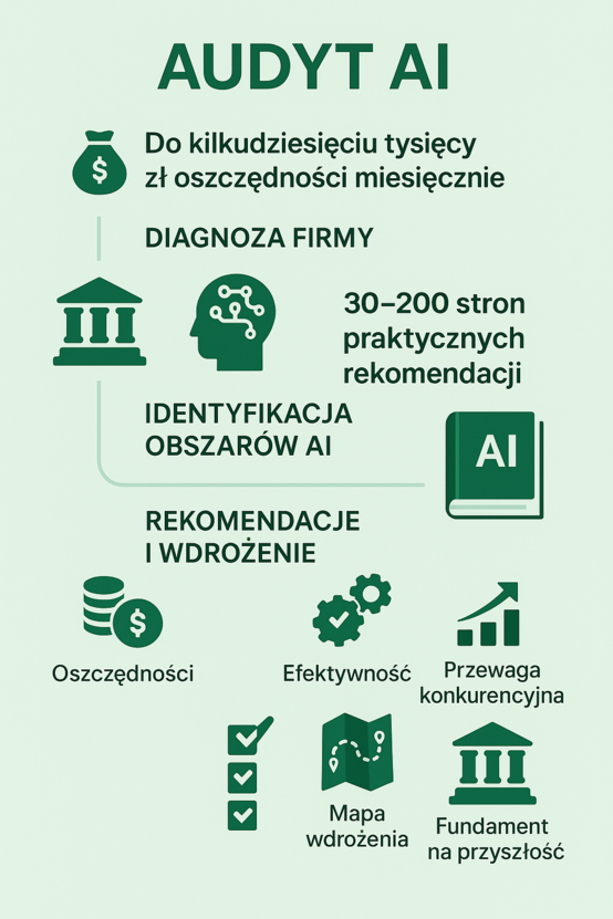 Nie pozwól, aby Twoja firma została w tyle. Rewolucja AI dzieje się teraz, a nasz audyt to najprostszy sposób, aby w pełni wykorzystać jej potencjał. To inwestycja, która zwraca się błyskawicznie.