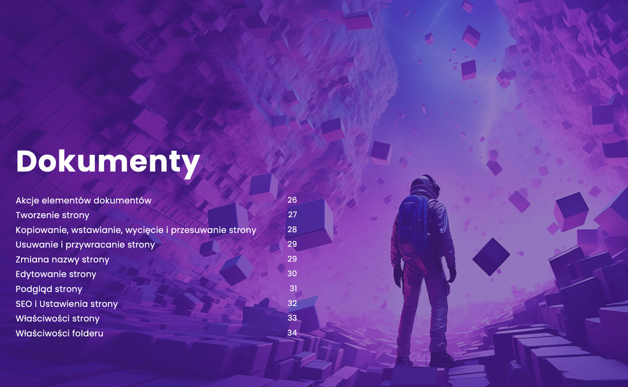Obszar „Dokumenty” obejmuje klasyczny system zarządzania treścią stron internetowych (CMS). Tutaj można edytować zawartość poszczególnych stron (dokumentów).