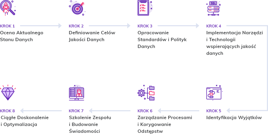 Na tym etapie tworzone są szczegółowe standardy i polityki dotyczące danych, które będą fundamentem w zapewnianiu ich jakości. Standardy i polityki danych powinny obejmować:
