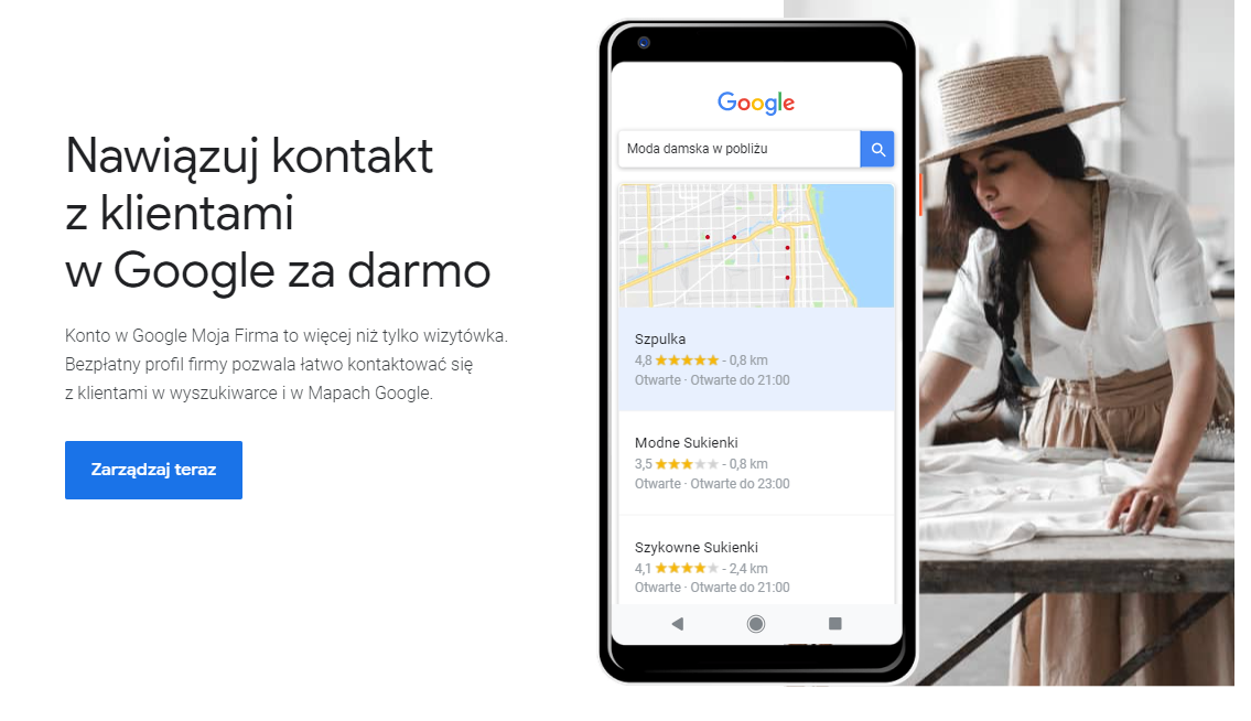 Kompletna wizytówka w Google Moja Firma to bardzo ważmy element działań off-site (poza stroną www). Dzięki niej znacznie zwiększasz swoje szanse, że po wpisaniu w wyszukiwarkę fraz powiązanych z określoną branżą, to właśnie dane Twojej firmy pokażą się jako jedne z pierwszych. Usługa Google Moja Firma jest dostępna dla każdego przedsiębiorcy bez żadnych opłat. Stworzenie wizytówki nie jest trudne. Możesz to zrobić w kilku prostych krokach za pomocą kreatora: https://www.google.com/miejsca. Samo posiadanie wizytówki to za mało – profil powinien być wyczerpujący i atrakcyjny. Warto publikować zdjęcia ze swojej oferty, i oferty specjalne, a także na bieżąco aktualizować informacje o firmie.