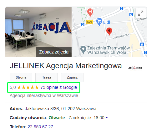 Gdy już utworzysz i odpowiednio zoptymalizujesz wizytówkę Google Moja Firma, Twoi klienci będą mogli wystawiać Ci oceny i pisać recenzje. Liczba i jakość tych ocen będzie miała wpływ również na pozycję w Google Maps oraz na CTR. Dlatego koniecznie zadbaj o to, aby opinii było dużo, np. prosząc stałych klientów o pozostawienie recenzji po wizycie. Można ich zachęcić np. oferując niewielki rabat na kolejne zakupy czy usługi. Opinie są ważne nie tylko ze względy na pozycjonowanie. Średnia ocena i rodzaj opinii stanowią bardzo ważny sygnał dla konsumentów i wielokrotnie są decydującym czynnikiem przy wyborze firmy, z której usług skorzystamy. Jeśli klient będzie miał do wyboru dwie restauracje w podobnej odległości i ze zbliżonymi cenami, zapewne wybierze tę, która ma lepsze recenzje.