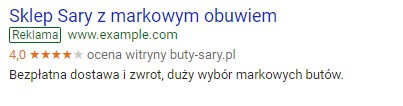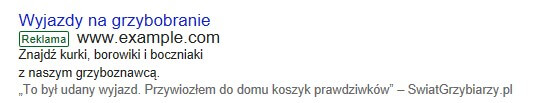 Gwiazdki to wciąż nie wszystko. Obok reklamy Twojej firmy może pojawić się także pełna treść opinii. W tym wypadku opinie nie mogą jednak pochodzić od użytkowników indywidualnych. Google zaciąga je od „uznanych podmiotów zewnętrznych”, czyli portali powiązanych z branżą w jakiej działa firm. To ty decydujesz, która opinia pojawi się obok twojej reklamy. Pamiętaj jednak o tym, że nie może być starsza niż rok. W innym wypadku Google jej po prostu nie wyświetli. Koniecznie trzeba też podać źródło, z którego pochodzi opinia.