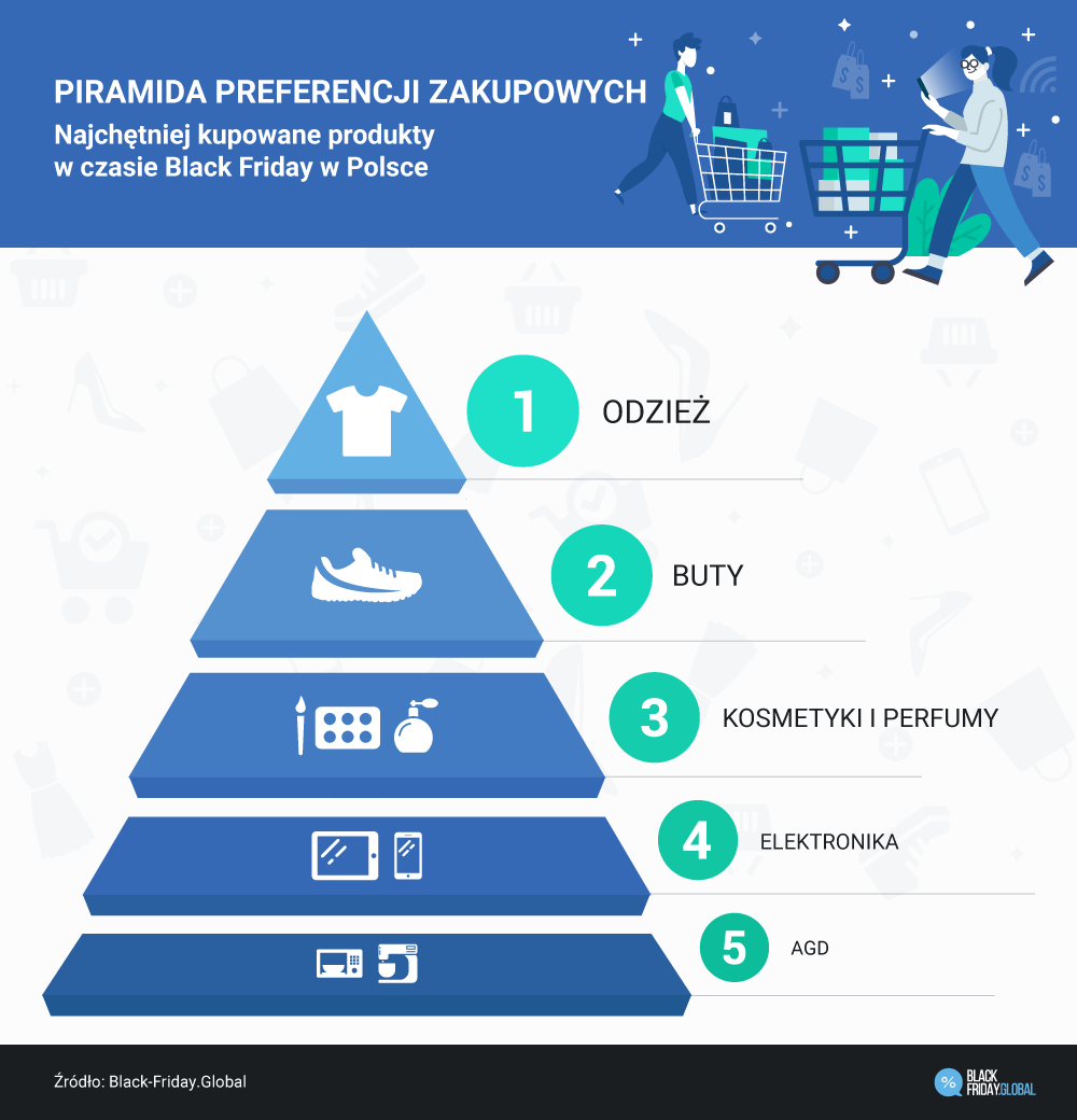 Ostatni piątek listopada od lat otwiera sezon przedświątecznych obniżek. Wiele osób wybiera właśnie ten dzień na zakup prezentów bożonarodzeniowych. Zarówno w Polsce, jak i na świecie podczas Black Friday najczęściej kupowane są ubrania. Do najpopularniejszych kategorii zakupowych zaliczają się również elektronika oraz obuwie. Na dalszych pozycjach rankingu plasują się kosmetyki, perfumy, sprzęt AGD i prezenty. Klienci często czekają na ten dzień, by dokonać zaplanowanego wcześniej zakupu sprzętu elektronicznego czy AGD z dużym rabatem. W 2018 roku sprzedający oferowali klientom średnio 46-procentową obniżkę cen.