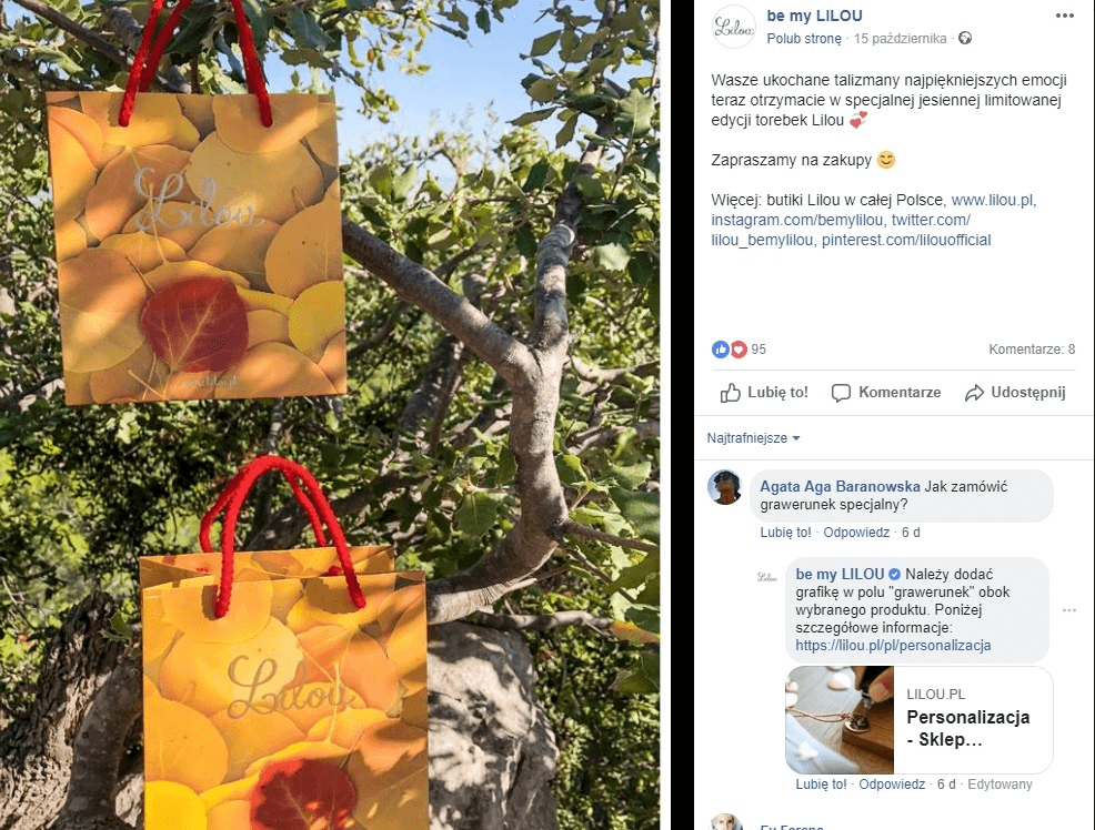 Jak widzimy, post zaangażował klientów. Nie tylko wysyłają zdjęcia prezentujące nowe torebki, lecz także oznaczają w komentarzach innych użytkowników. Działania PR-owe przyniosły zamierzone rezultaty. Widzimy interakcję, dialog, zaangażowanie i przede wszystkim zadowolenie klientów.