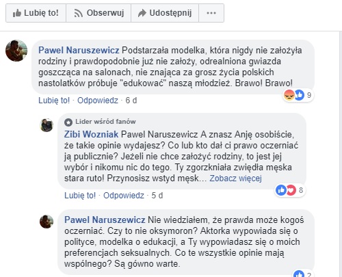 Poniżej widzimy komentarz na fanpage’u znanej polskiej modelki Anjii Rubik. Temat dotyczył braku edukacji seksualnej nastolatków w szkołach.