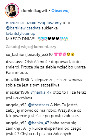 Poniżej widzimy komentarze opublikowane na Instagramie, w których przedmiotem krytyki jest otyłość znanej aktorki telewizyjnej i teatralnej Dominiki Gwit.