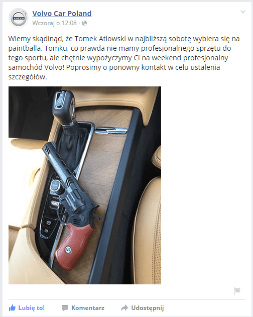 Na powyższych zdjęciach widzimy, że użytkownik jednego z serwisów społecznościowych wysłał nietypową wiadomość do Volvo. Firma nie zignorowała jej, mimo, że informacja nie dotyczyła ich samochodów. Wręcz przeciwnie – raczej działań marketingowych. Z konwersacji wynika sytuacja, która jest przykładem na dobry real time marketing. Volvo skierowało jeden ze swoich postów do użytkownika. Wyróżniło go z imienia i nazwiska oraz nawiązało do zaistniałej sytuacji. Marka zaprosiła pana Tomka do wypożyczenia auta na weekend. Post nie został bez odzewu.