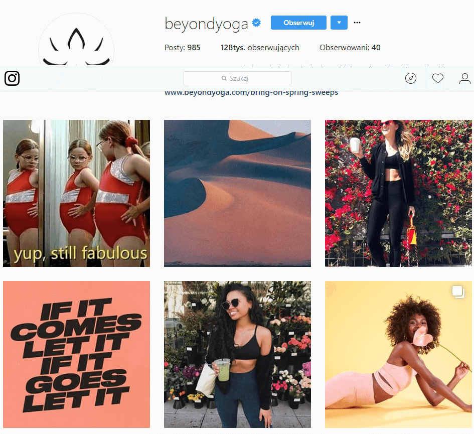 Nie wiesz jak wykorzystać Instagram Stories, żeby trafić do odpowiednich klientów? Przykładem marki, która rozumie klientów jest Beyond Yoga. Ich produkty są skierowane do aktywnych kobiet. W swoich social media nie zamieszczają jednak zdjęć modelek. Firma stawia na naturalny look i panie w każdym rozmiarze. Wydaje się, że taki obraz kobiety nie będzie współgrał z treściami, które są prezentowane na Instagramie. Marka jednak zdobywa ciągle nowych fanów! Dzieje się tak dlatego, że w krótkich filmach nagrywa naturalne kobiety w swoich strojach do yogi. Jednocześnie wykorzystuje w Stories promocję swojej strony internetowej. Każdy opublikowany film zostaje oznaczony na dole łączem, które prowadzi do sklepu Beyond Yoga. Marka oznacza też na zdjęciach do jakiego produktu kieruje link. Dzięki temu, że posty znikają ze Stories po 24h, są świetnym sposobem na proponowanie zniżek i zapowiedzi nowych produktów.