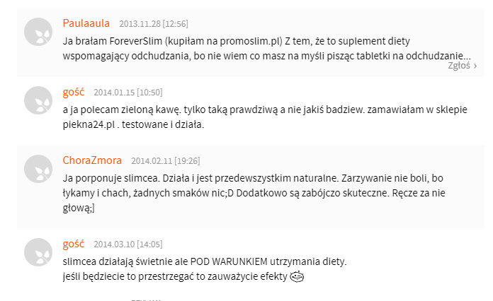 Powyżej widzimy cztery komentarze, z których dwa mówią pozytywnie o produkcie Slimcea. Użyte sformułowania „zabójczo skutecznie” czy „działają świetnie” w prawie 80% skłonią potencjonalnego klienta do zakupu. Co więcej, użytkownicy nie podają nazwy sklepu, w którym sprzedawany jest produkt, a wypowiedzi pozbawione są nachalnej perswazji. W prosty i skuteczny sposób zarekomendowano suplement Slimcea,przez co wypowiedź wydaję się wiarygodna.