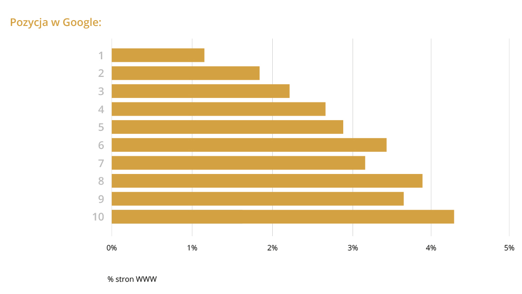 Nowe strony prawie nigdy nie wyświetlają się też wśród pierwszych wyników (1-3). Tylko 1% stron zaindeksowanych przed rokiem udało się osiągnąć pierwszą pozycję w Google.