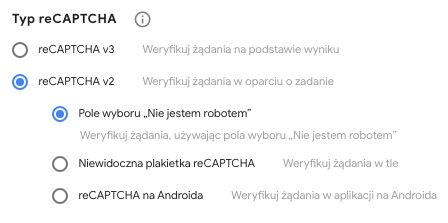 4.2. W typie reCAPTCHA wybieramy wersję v2 i opcję "Nie jestem robotem":